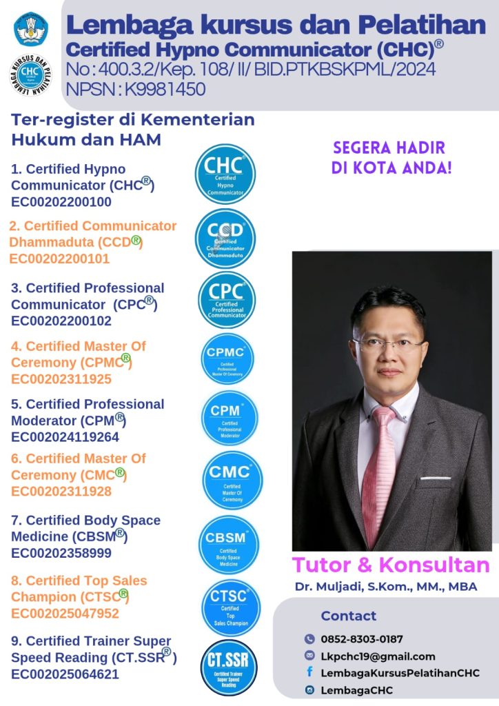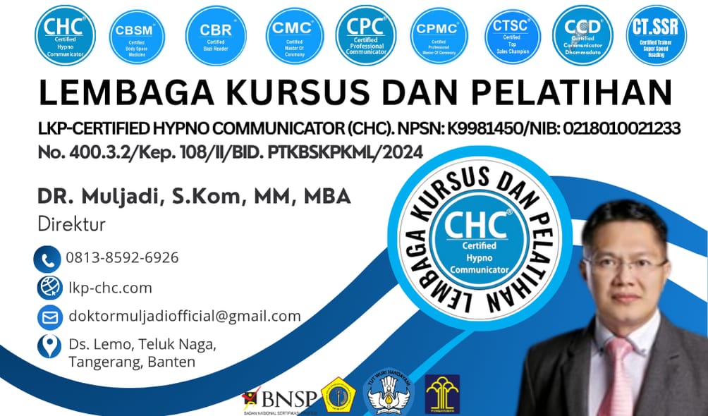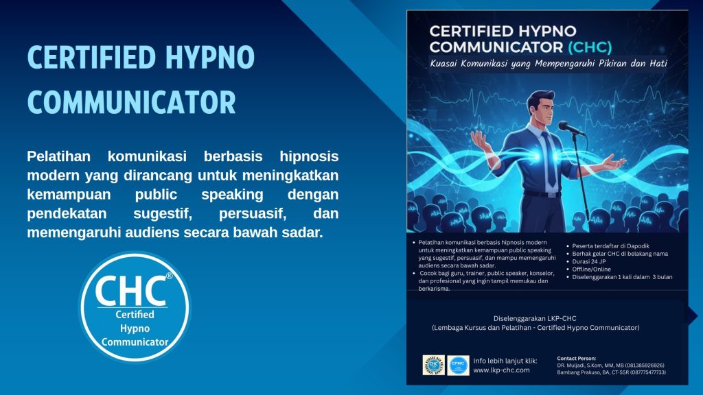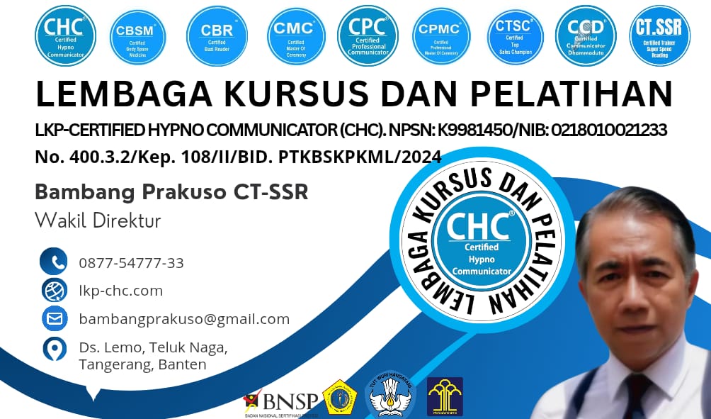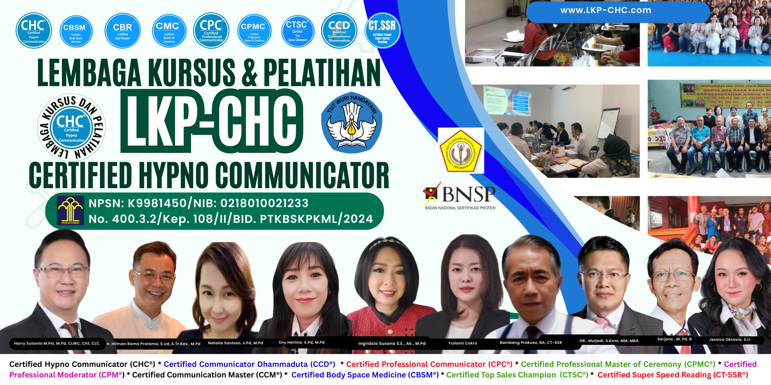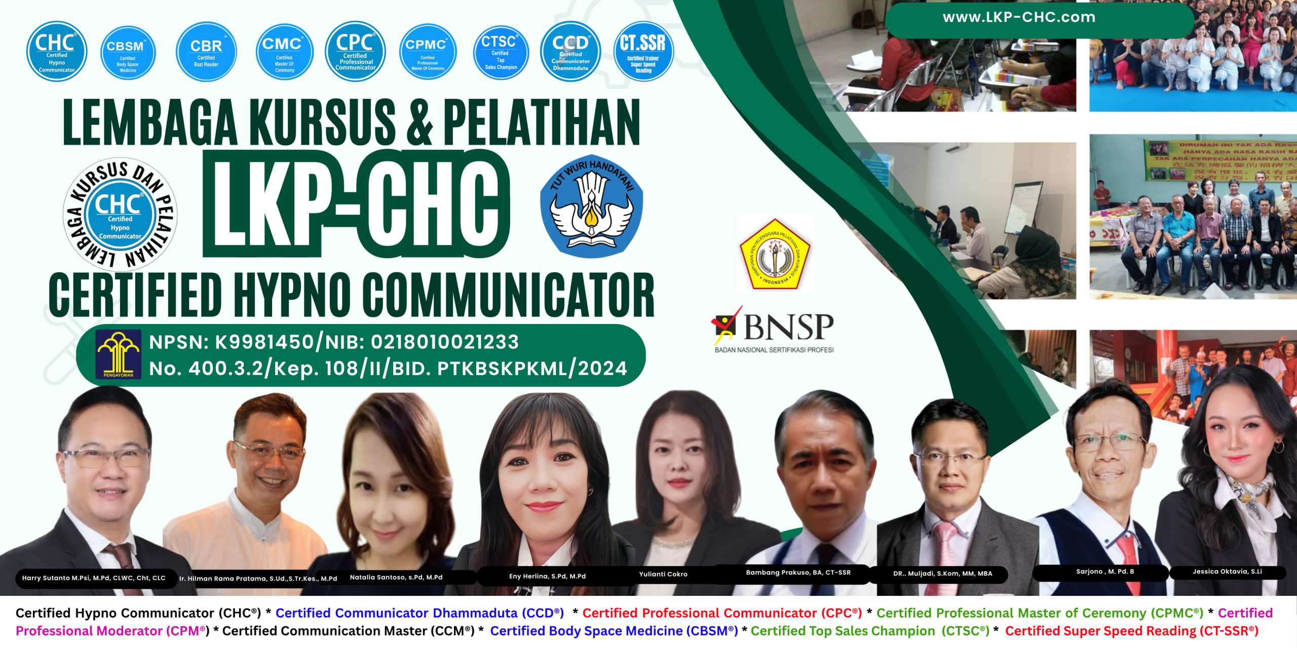 LKP CHC (Certified Hypno Communicator) adalah lembaga pelatihan resmi yang fokus pada pengembangan diri, komunikasi sadar & bawah sadar, public speaking, dan hypnotherapy.