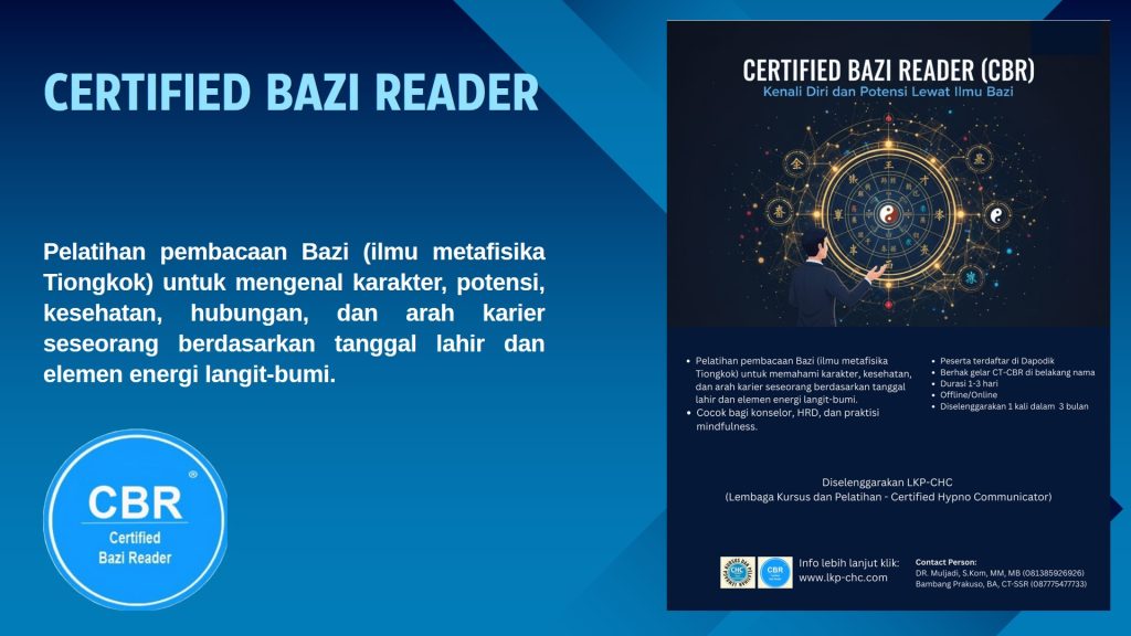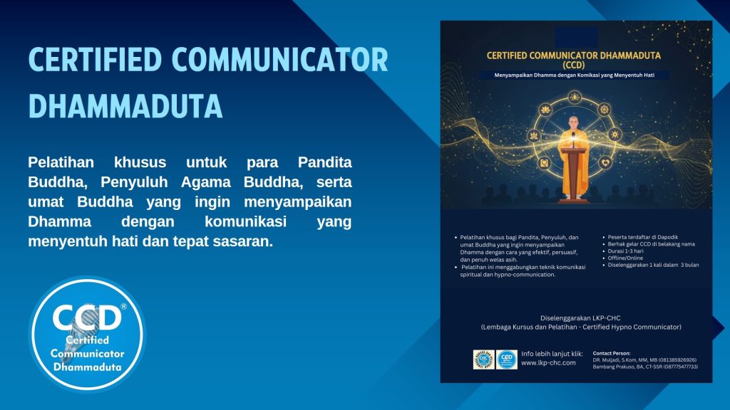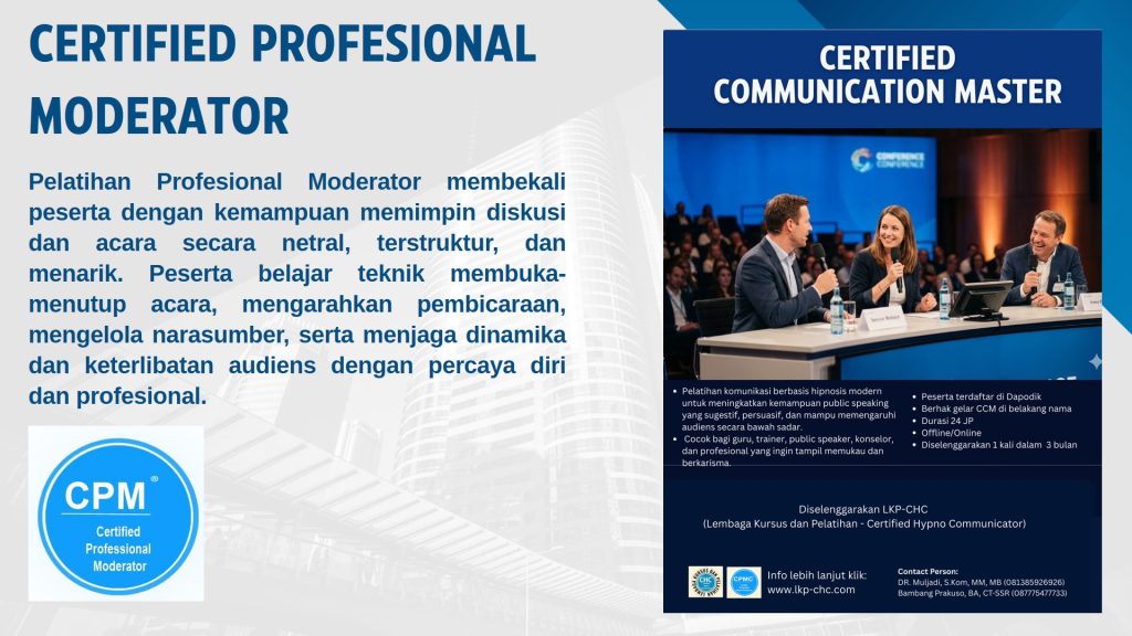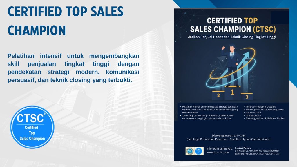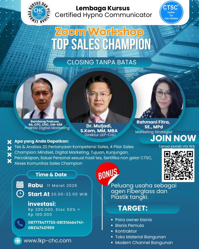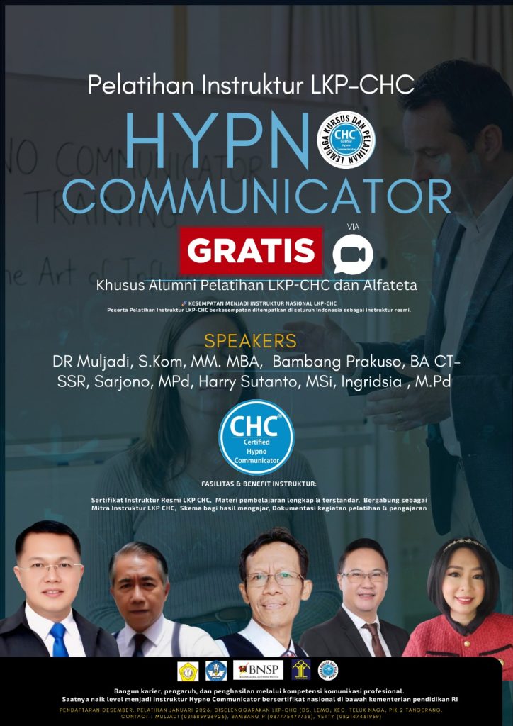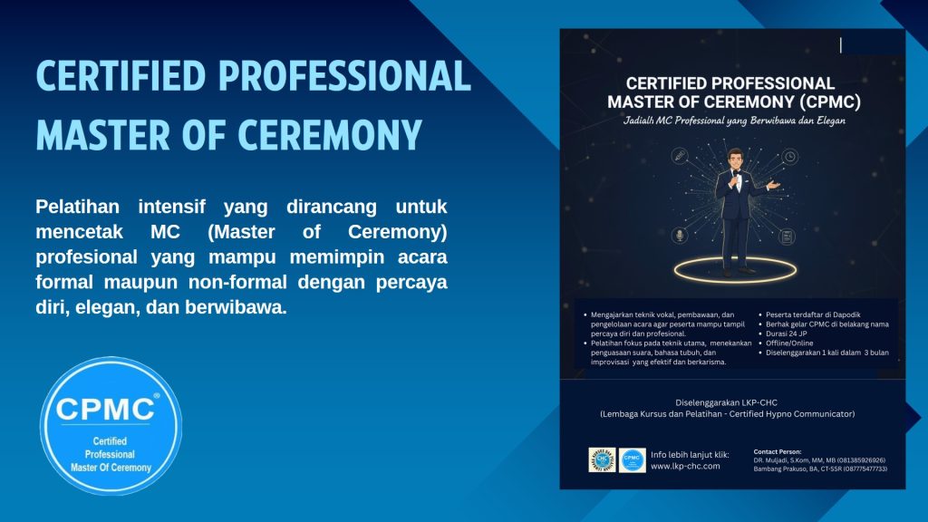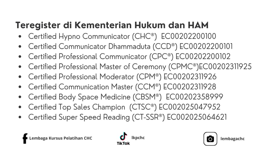 LKP CHC (Certified Hypno Communicator) adalah lembaga pelatihan resmi yang fokus pada pengembangan diri, komunikasi sadar & bawah sadar, public speaking, dan hypnotherapy.