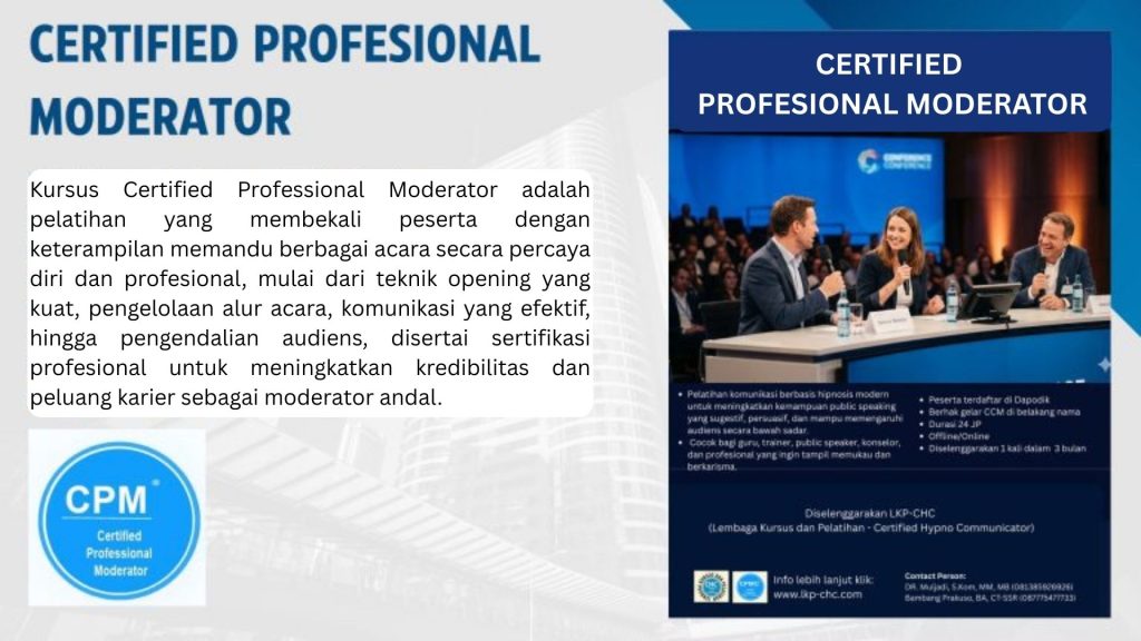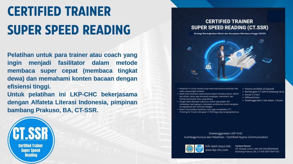 LKP CHC juga menghadirkan layanan kursus profesional di bidang hypnotherapy, komunikasi pengaruh, public speaking, dan pengembangan diri. Melalui pendekatan praktis dan berbasis sertifikasi, kami membimbing peserta dari berbagai latar belakang—mulai dari pelajar, mahasiswa, karyawan hingga praktisi—untuk menguasai keterampilan yang relevan, aplikatif, dan berdampak langsung dalam kehidupan pribadi maupun karier.
