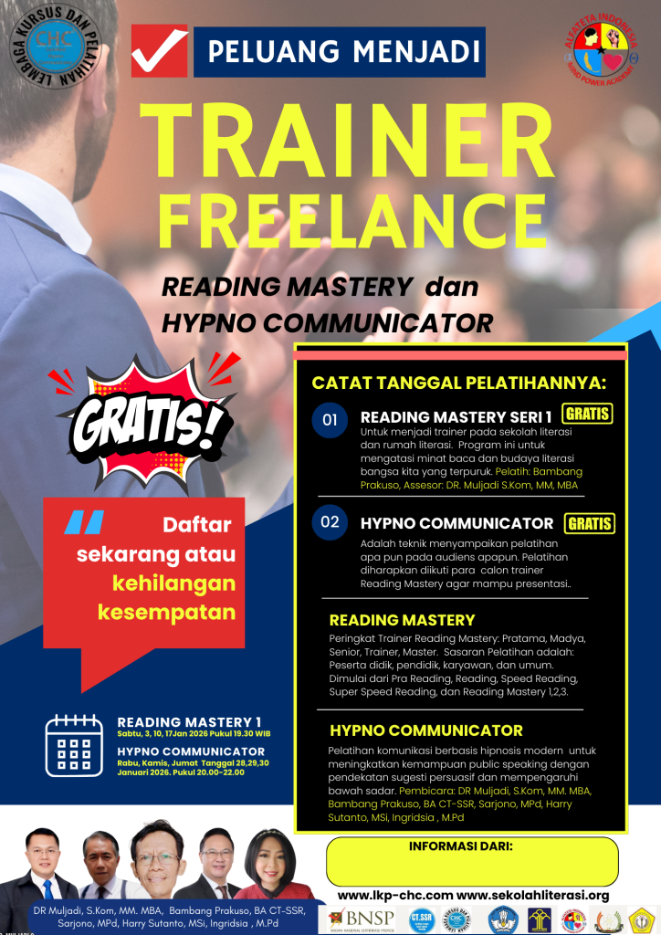 Pelatihan Profesional & Sertifikasi Resmi dalam bidang Public Speaking, Hypnotherapy, Emotional Healing, Hypnoteaching, dan Komunikasi Sadar.